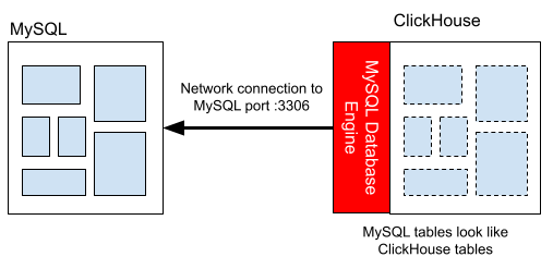 ClickHouse can run queries on MySQL data using the MySQL database engine, which makes MySQL data appear as local tables in ClickHouse. Enabling it is as simple as executing a single SQL command like the following on ClickHouse:
