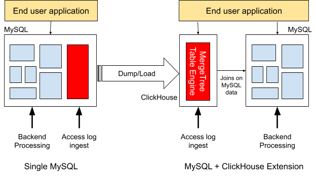 Migrating large tables with immutable records permanently to ClickHouse can give vastly accelerated analytic query performance while simultaneously unloading MySQL. The following diagram illustrates how to migrate a table containing web access logs from ClickHouse to MySQL.
