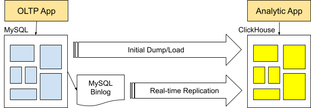 The other way to extend MySQL is to mirror the data in ClickHouse and keep it up to date using replication. Mirroring allows users to run complex analytic queries on transaction data without (a) changing MySQL and its applications or (b) affecting the performance of production systems.