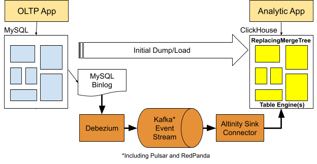 Altinity has developed a new approach to replication using Debezium, Kafka-compatible event streams, and the Altinity Sink Connector for ClickHouse. The mirroring configuration looks like the following.