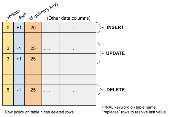 ReplacingMergeTree – Currently users must include the FINAL keyword on table names to force the merging of row changes. It is also necessary to add a row policy to make deleted rows disappear automatically. There are pull requests in progress to add a MergeTree property to add FINAL automatically in queries as well as make deleted rows disappear without a row policy. Together they will make handling of replicated updates and deletes completely transparent to users.
