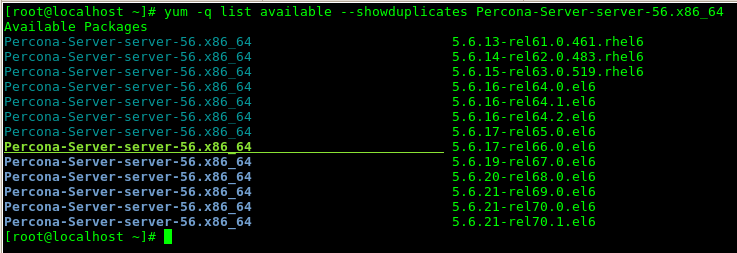 What if we want to downgrade, but let’s say few versions down? It is also possible with a single YUM command. By the way, after the last step we are on Percona Server 5.6.17 rel66.0 version and YUM nicely shows that when listing all available packages, see the screen shot below: