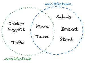 127.0.0.1:6379> SINTER user:42:favfoods user:91:favfoods 1) "Pizza" 2) "Tacos" |