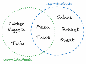 127.0.0.1:6379> SINTER user:42:favfoods user:91:favfoods<br>1) "Pizza"<br>2) "Tacos" |