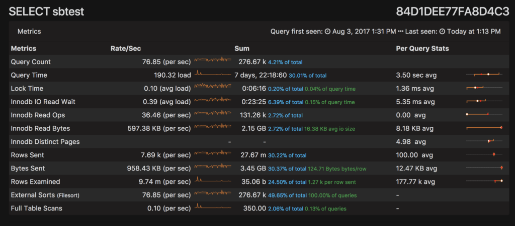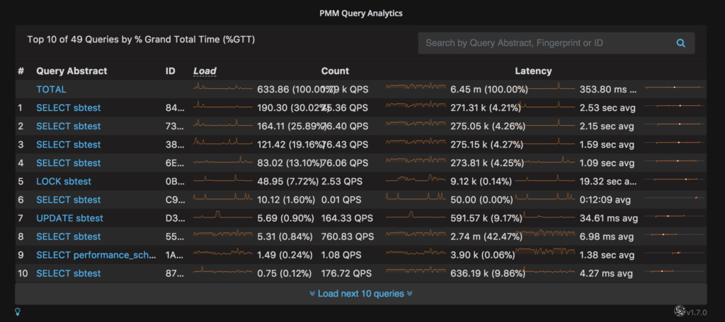 Finally, in the modern world, we want all this data aggregated together, visualized and easily accessible. Everything from explains to statistics to profiles to digests, and we want it all compiled in a nice neat package. Enter Percona Monitoring and Management (PMM) Query Analytics. (Screenshots are from PMM v1.7, other versions may look different.)