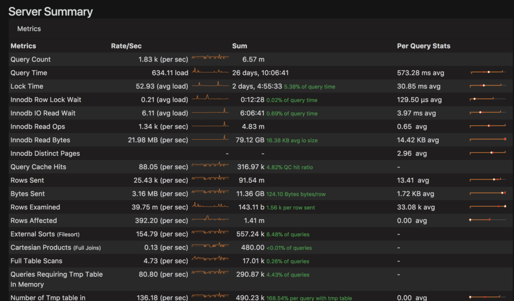 # 8.1s user time, 60ms system time, 26.23M rss, 62.49M vsz<br># Current date: Thu Dec 29 07:09:32 2011<br># Hostname: somehost.net<br># Files: slow-query.log.1<br># Overall: 20.08k total, 167 unique, 16.04 QPS, 0.01x concurrency ________<br># Time range: 2011-12-28 18:42:47 to 19:03:39<br># Attribute total min max avg 95% stddev median<br># ============ ======= ======= ======= ======= ======= ======= =======<br># Exec time 8s 1us 44ms 403us 541us 2ms 98us<br># Lock time 968ms 0 11ms 48us 119us 134us 36us<br># Rows sent 105.76k 0 1000 5.39 9.83 32.69 0<br># Rows examine 539.46k 0 15.65k 27.52 34.95 312.56 0<br># Rows affecte 1.34k 0 65 0.07 0 1.35 0<br># Rows read 105.76k 0 1000 5.39 9.83 32.69 0<br># Bytes sent 46.63M 11 191.38k 2.38k 6.63k 11.24k 202.40<br># Merge passes 0 0 0 0 0 0 0<br># Tmp tables 1.37k 0 61 0.07 0 0.91 0<br># Tmp disk tbl 490 0 10 0.02 0 0.20 0<br># Tmp tbl size 72.52M 0 496.09k 3.70k 0 34.01k 0<br># Query size 3.50M 13 2.00k 182.86 346.17 154.34 84.10<br># InnoDB:<br># IO r bytes 96.00k 0 32.00k 20.86 0 816.04 0<br># IO r ops 6 0 2 0.00 0 0.05 0<br># IO r wait 64ms 0 26ms 13us 0 530us 0<br># pages distin 28.96k 0 48 6.29 38.53 10.74 1.96<br># queue wait 0 0 0 0 0 0 0<br># rec lock wai 0 0 0 0 0 0 0<br># Boolean:<br># Filesort 4% yes, 95% no<br># Filesort on 0% yes, 99% no<br># Full scan 4% yes, 95% no<br># QC Hit 0% yes, 99% no<br># Tmp table 4% yes, 95% no<br># Tmp table on 2% yes, 97% no |