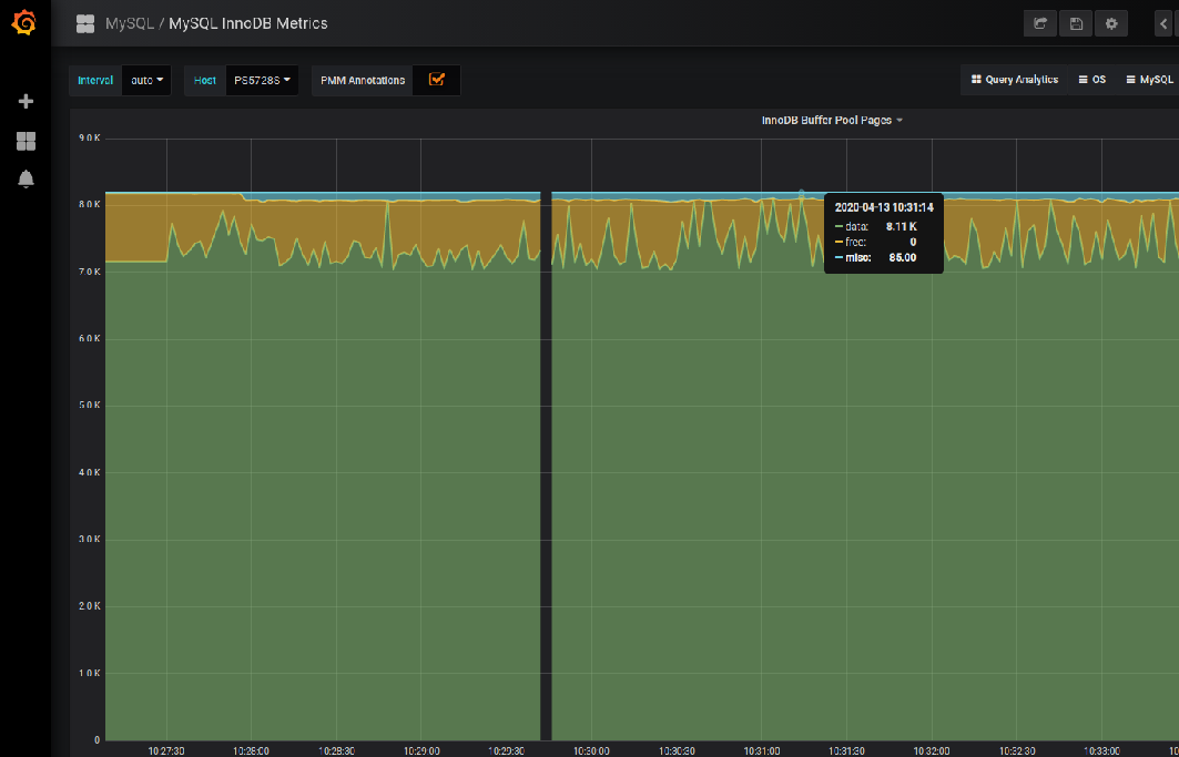 Monitoring tools like Percona Monitoring and Management (PMM) would be very useful to inspect the above aspects. In the below example screenshot captured from my local PMM GUI, you can see that the free pages inside the buffer pool are almost empty at different points in time which is one of the causes behind this situation as explained above. This data is available from the InnoDB Buffer Pool Pages panel of MySQL InnoDB Metrics dashboards.