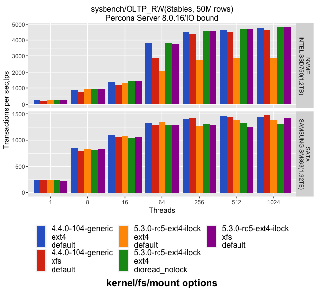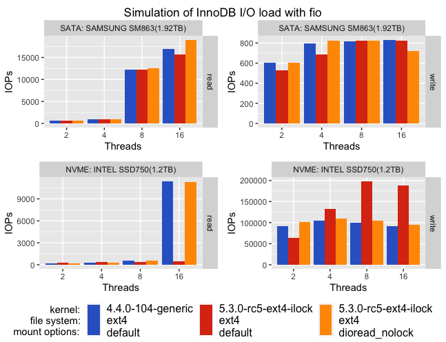 So in the case of InnoDB tablespaces that are opened with O_DIRECT, we have a mix of sync reads and async writes and it turned out that such a combination along with sync writes to innodb log file is enough to cause notable performance regression as well. I have sketched the workload for fio tool (see below) that simulates the I/O access pattern for InnoDB and have run it for SSD and NVMe drives for linux kernels 4.4.0, 5.3.0, and 5.3.0 with ext4 scalability fix.