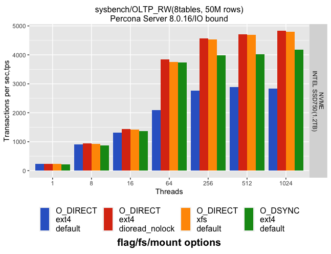 As ext4 regression affects O_DIRECT, let’s replace O_DIRECT with O_DSYNC and look at results of the same sysbench/OLTP_RW workload on kernel 5.3.0: