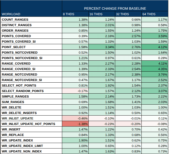 Before discussing specific improvements, let me describe how we measured the kind of performance gain we achieved. The top-level approach is common for benchmarks: you need a baseline version and then compare your modified version to that baseline. At Percona, we have a dedicated environment for performance testing. For detailed information about our testing methodology, the sysbench workloads used, and the hardware configuration, please see our previous blog post: Percona Server for MySQL Performance Improvements.