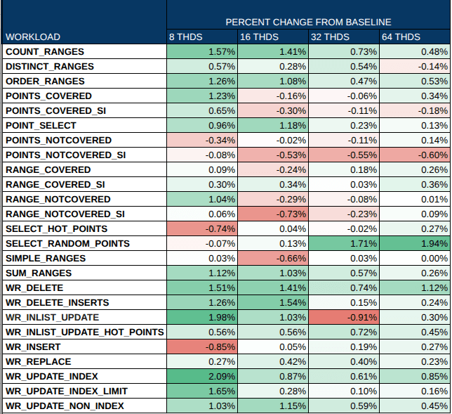 Here are the results of benchmarking. Each cell displays the improvement percentage compared to the baseline version. In other words, it says how much faster or slower is the changed version in comparison to the baseline version.
