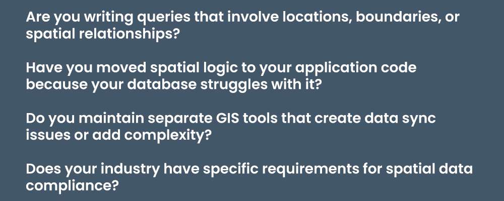 Do you find yourself struggling with geospatial data in your database? You know the feeling: you need quick answers about locations, distances, and relationships between points on a map, but your database just wasn’t built for these questions.
