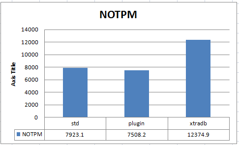 Result is in NOTPM (New Order Transactions Per Minute), more is better. As you see XtraDB is somewhat 1.5x better than InnoDB in standard 5.1.30 and even more than InnoDB-plugin-1.0.2