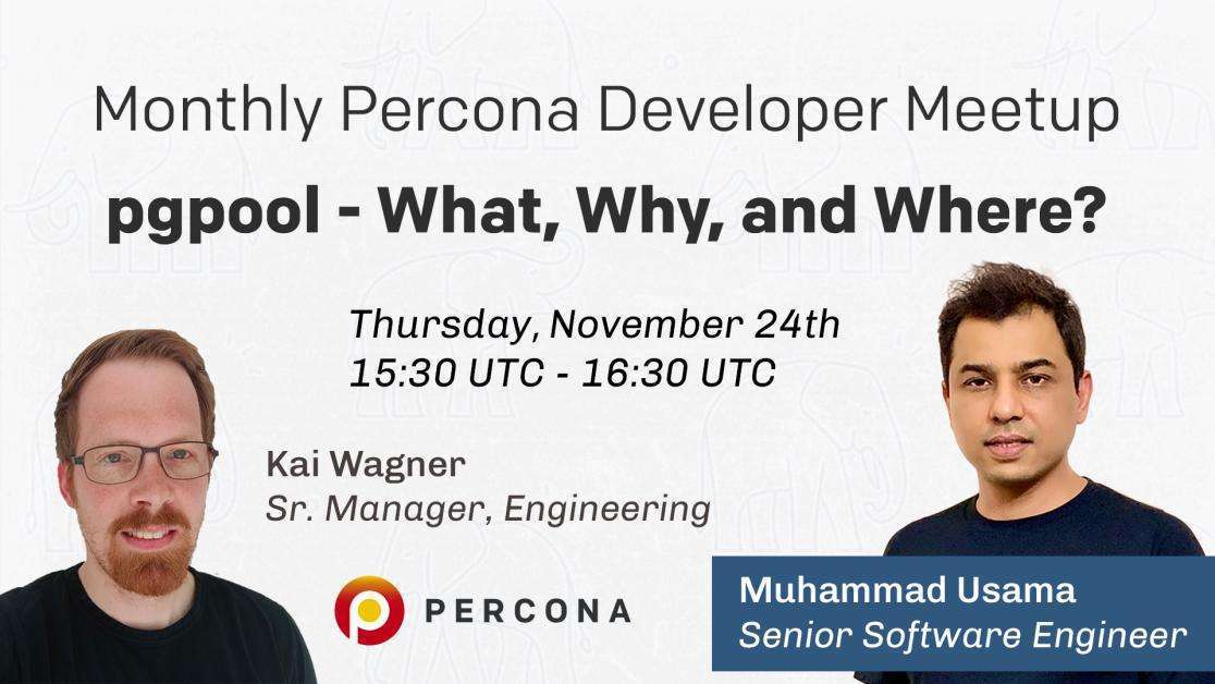 We invite you to join our Monthly Developer Meetup on November 24th at 15:30 UTC. Muhammad Usama (Senior Software Engineer, Percona) and Kai Wagner (Sr. Manager) will participate and discuss pgpool – What, Why, and Where? Also, you will have a chance to join the studio and chat with them.