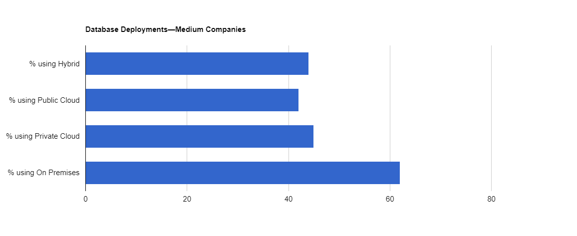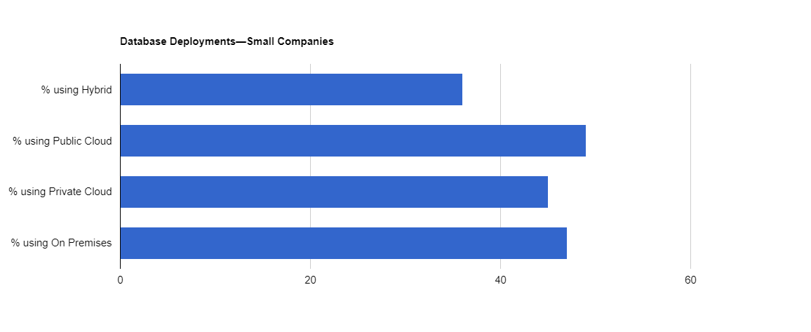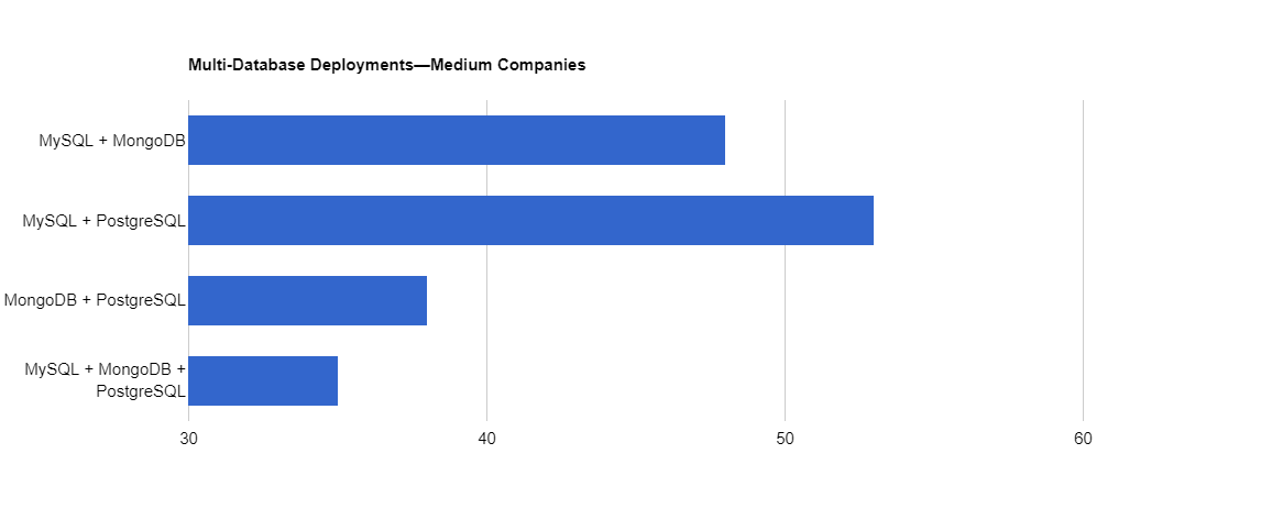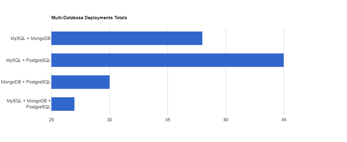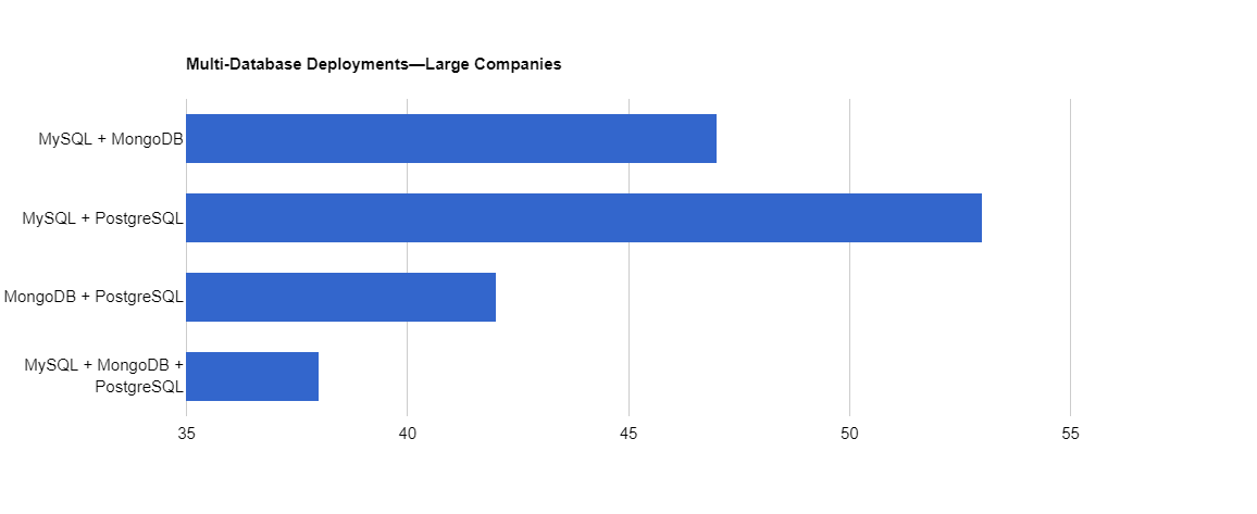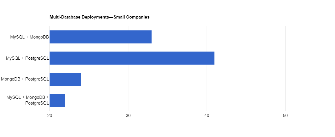 Medium-sized companies increased their adoption of multi-database deployments the most in 2020, with an 8% increase in the combinations of MySQL and MongoDB, and MongoDB and PostgreSQL, and a 7% increase in the mix of MySQL, MongoDB, and PostgreSQL. This growth in multi-database adoption by medium-sized companies could be a result of companies wanting to stay agile and avoid vendor lock-in by using open source alternatives.