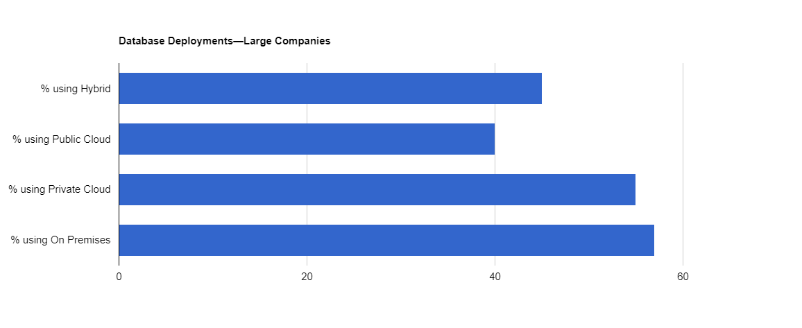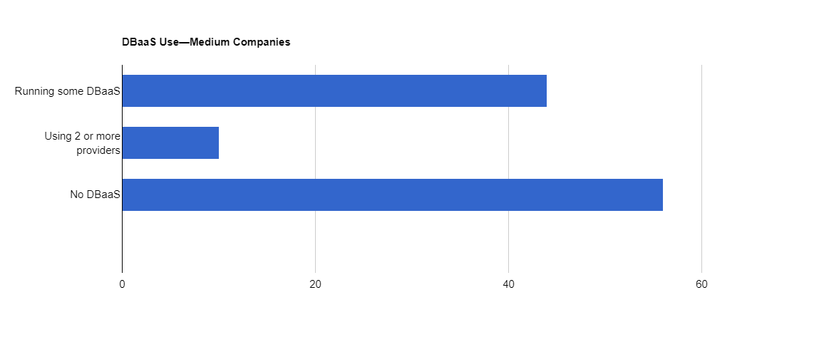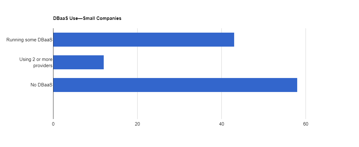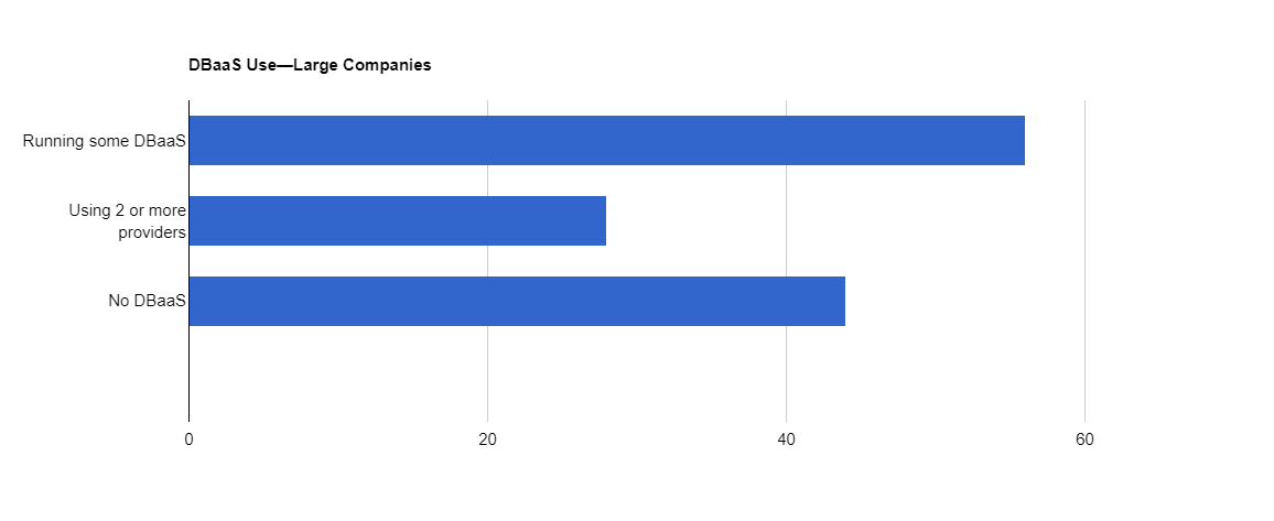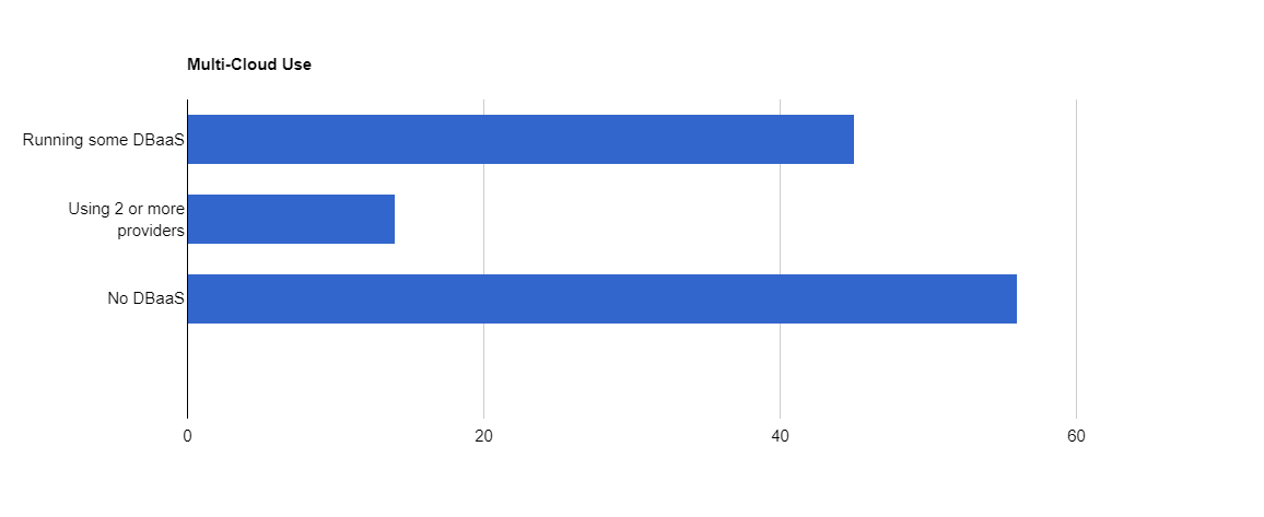 Our results showed a bump in companies now ‘running some DBaaS,’ up from 40% in 2019 to 45% in 2020. Unsurprisingly, this also meant companies that are running ‘No DBaaS’ fell from 60% in 2019 to 56% in 2020.
