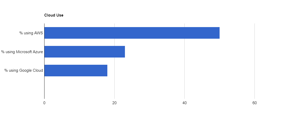 Unsurprisingly AWS continues to dominate the public cloud provider market, with a bump from 46% of respondents using its cloud platform in 2019 to 50% in 2020. Microsoft Azure jumped to 23% from 16% in 2019, but Google Cloud failed to make an impact this year with an adoption rate that remained static year-or-year at 18%.