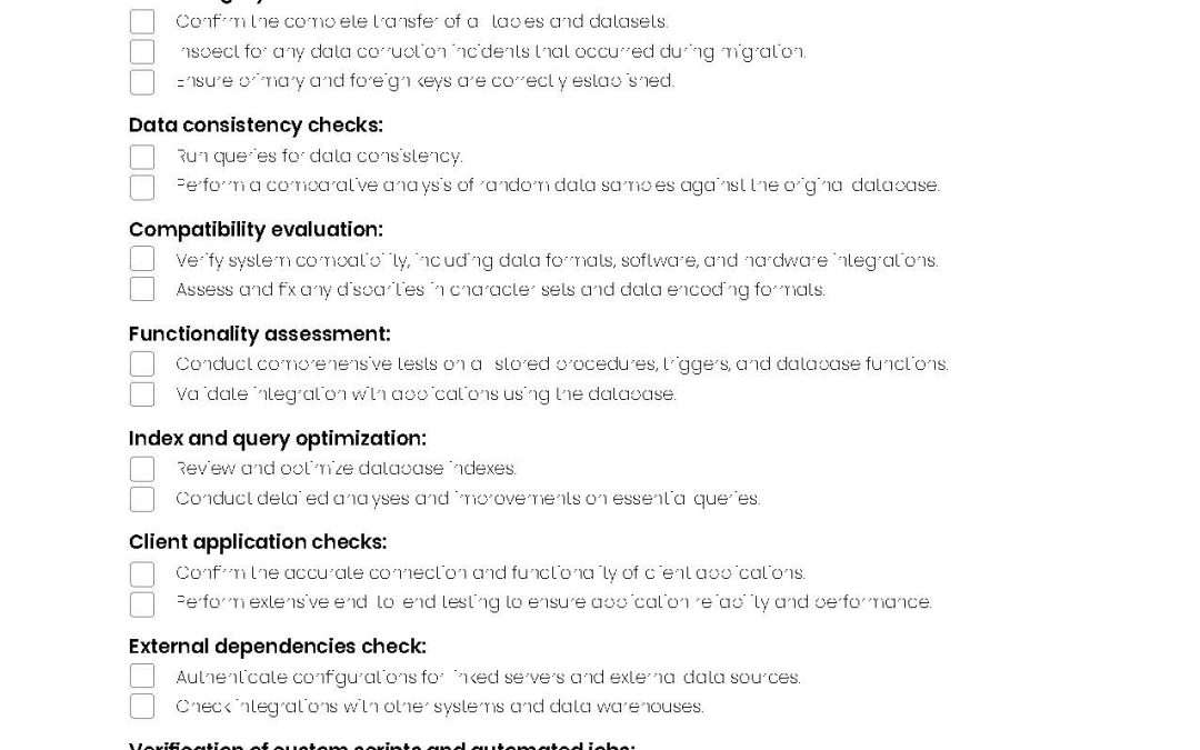 This checklist is a comprehensive guide for experienced or new DBAs and database architects to navigate post-migration processes. It’s designed to streamline the completion of database migrations, mitigating risks and enhancing the efficiency of your newly migrated database system.