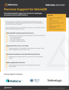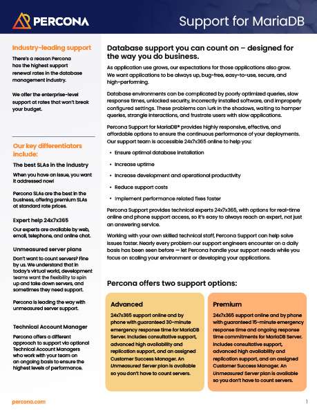 Percona Support for MariaDB provides you with real-time electronic and phone access to our expert technical team. Our 24x7x365 online and phone access policy ensures that you can always reach one of our technical experts, not an answering service. Our phone and chat lines are served by our amazing technical experts who can immediately engage with you on support requests.