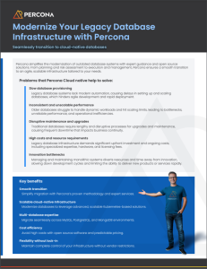 Percona simplifies the modernization of outdated database systems with expert guidance and open source solutions. From planning and risk assessment to execution and management, Percona ensures a smooth transition to an agile, scalable infrastructure tailored to your needs.