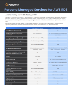 Percona Managed Services for AWS RDS Percona Managed Services extend AWS RDS for MySQL and PostgreSQL, delivering advanced performance tuning, hands-on troubleshooting, and customized optimization beyond built-in automation—so your databases run efficiently at any scale. Get the datasheet