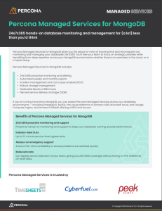 Percona Managed Services for MongoDB Percona Managed Services for MongoDB ensures your databases are monitored and managed 24x7x365 by technical experts—whether on-premises, in the cloud, or hybrid. Services include: 24x7x365 proactive monitoring and alerting Automated reports (weekly/monthly) Incident management and root cause analysis (RCA) Change management Dedicated DBA hours Named service delivery manager (SDM) Get the datasheet