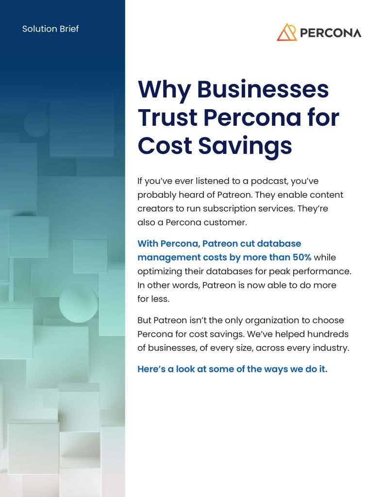 Percona has helped hundreds of businesses of all sizes cut database costs — some by more than 50% — while optimizing their databases for peak performance. Read about several companies that saved big, and learn how Percona helped them through architecting and design, performance tuning, ensuring high availability, and a lot more